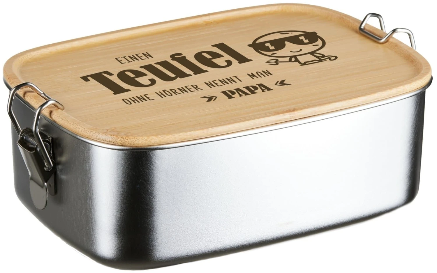 Grafik ist per Lasergravur graviert mit dem Spruch: Einen Teufel ohne Hörner nennt man Papa 😎😈