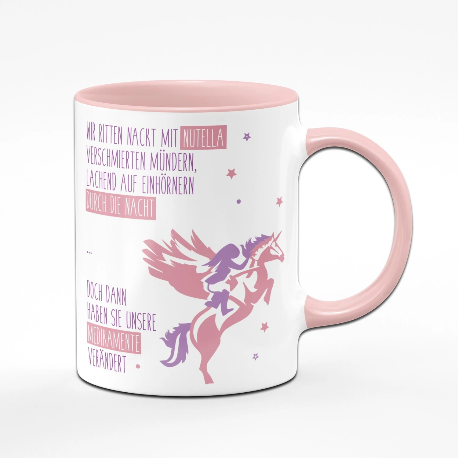 Tasse mit Spruch: Wir ritten nackt mit Nutella verschmierten Mündern lachend auf Einhörnern durch die Nacht. Doch dann haben Sie unsere Medikamente verändert. 🦄 (rosa)