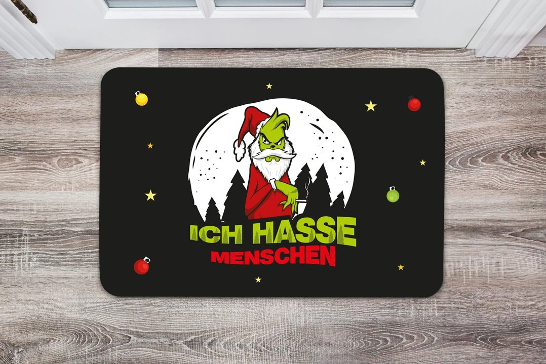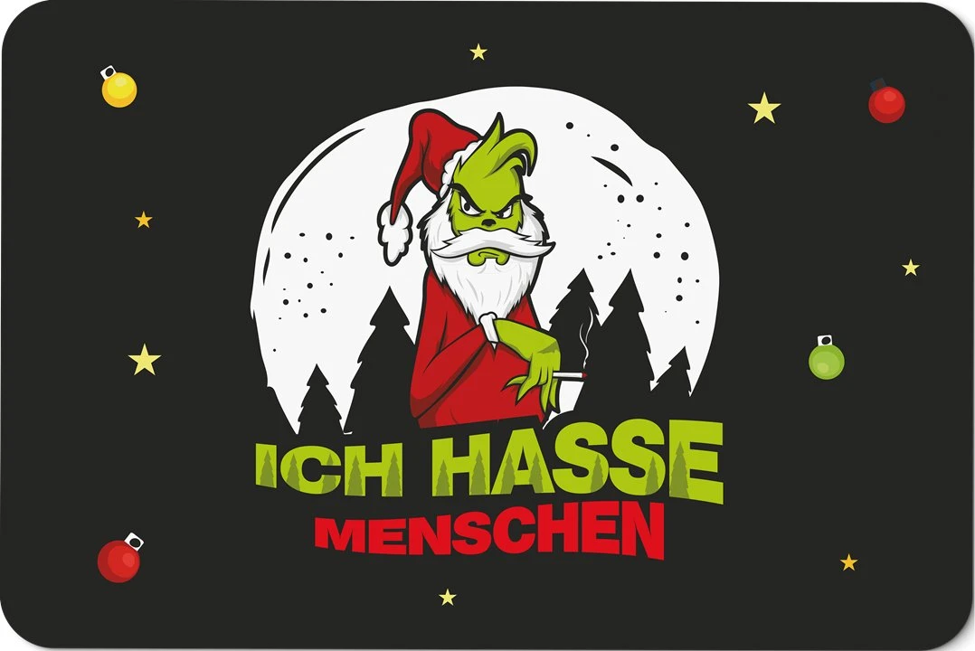 Das Highlight dieser Matte ist der Spruch „Ich hasse Menschen“, der dezent, aber wirkungsvoll unter dem Grinch-Design prangt. Ob du sie für dich selbst kaufst oder als Wichtelgeschenk für jemanden, der ebenfalls genug von übertriebener Weihnachtsstimmung hat – dieser Hingucker sorgt garantiert für ein Schmunzeln oder zustimmendes Nicken.