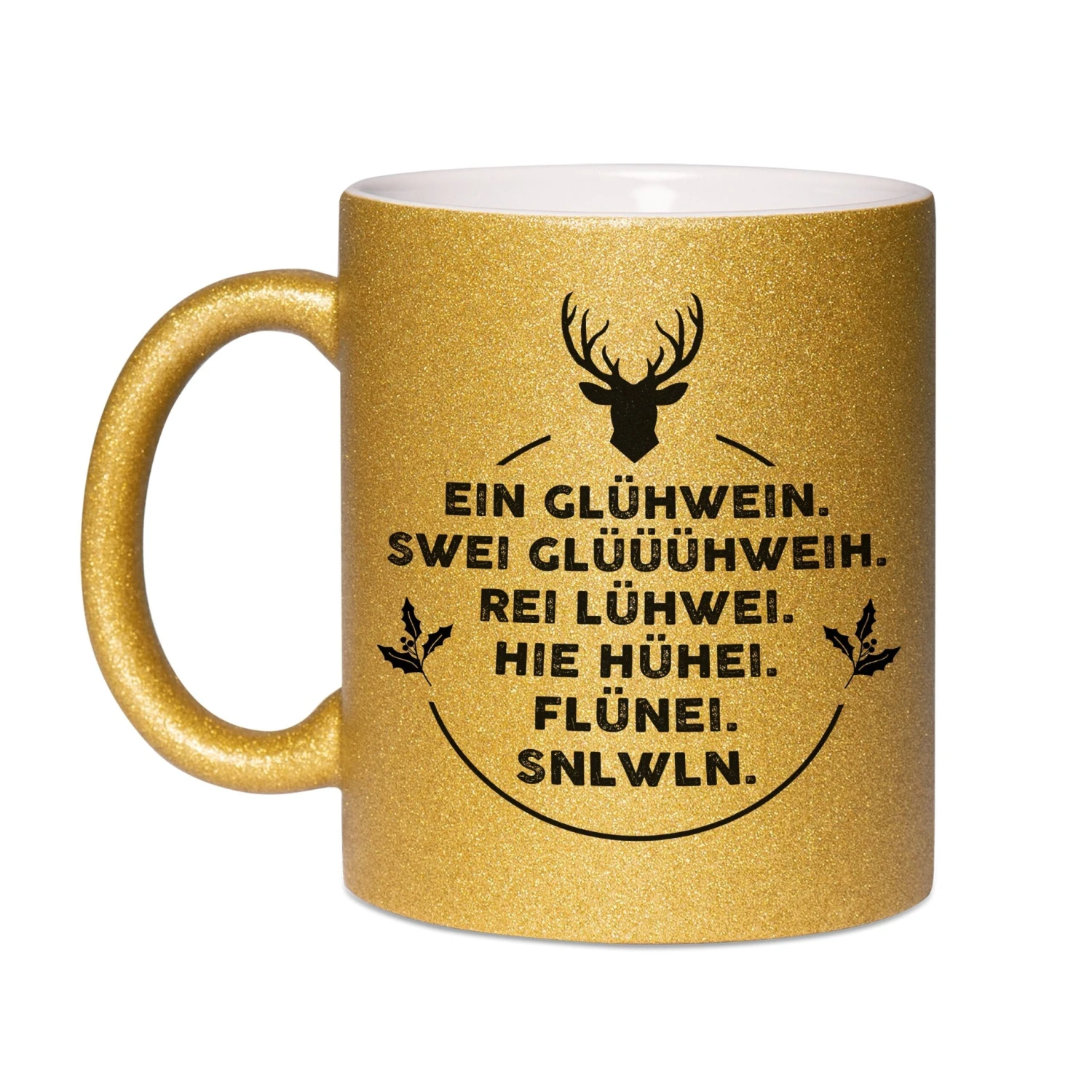 Weihnachts-Glitzertasse mit Spruch: Ein Glühwein, swei Glüüüühwein, Rei Lühwei