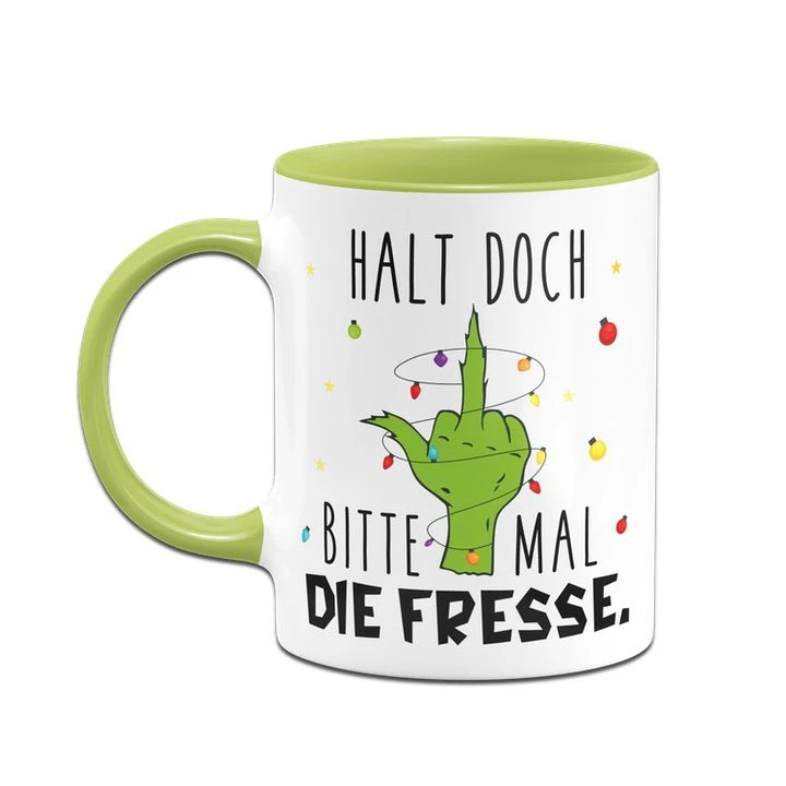 Weihnachtstasse mit Spruch: Halt doch bitte mal die Fresse. 🖕⭐ (Grinch)
