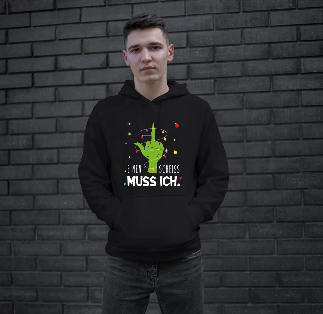 Zeig der Welt, dass du von all dem Weihnachtszauber nicht viel hältst, mit diesem einzigartigen Grinch Hoodie! Warum wie alle anderen „Merry Christmas“ sagen, wenn du stattdessen deutlich machen kannst, was du wirklich denkst? Der Hoodie präsentiert stolz den Grinch, der all den Christmas-Liebhabern da draußen unmissverständlich den Mittelfinger zeigt. Der Spruch „Einen Scheiss muss ich.“ macht die Botschaft noch deutlicher.