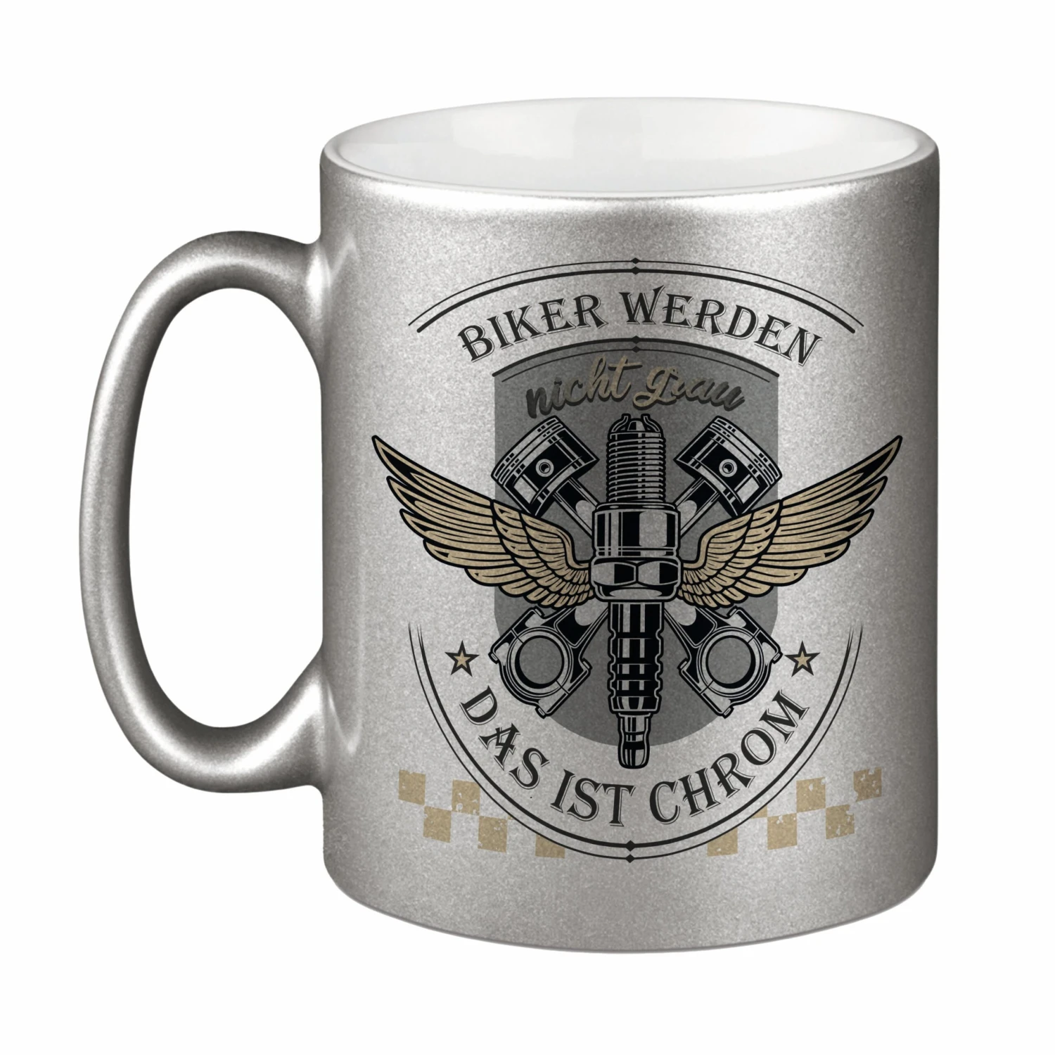 Motorrad Metallictasse mit Spruch: Biker werden nicht grau ⭐ das ist Chrom