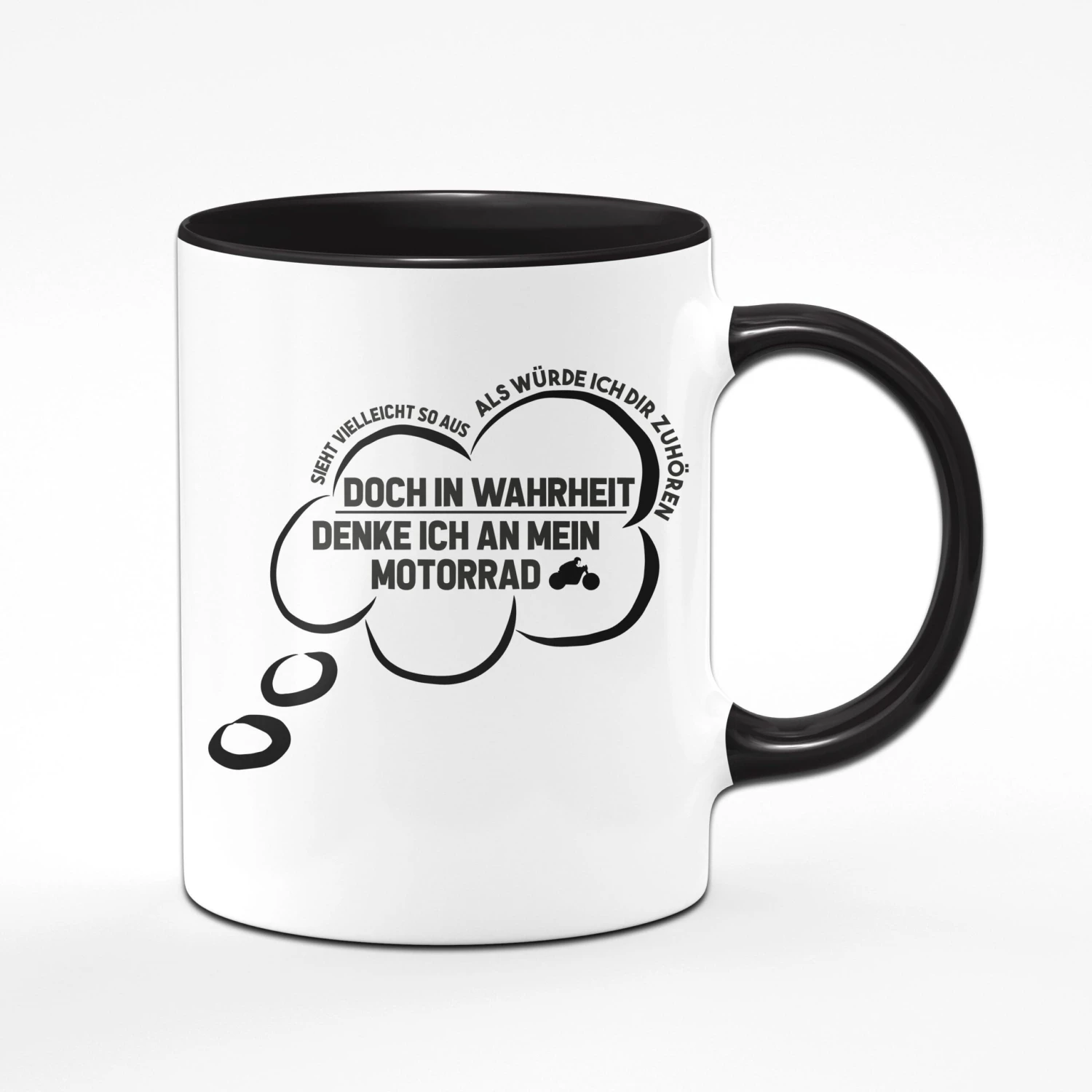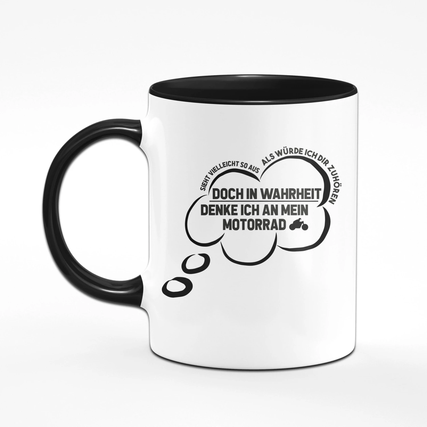 Tasse mit Spruch: Sieht vielleicht so aus als würde ich dir zuhören 💭 doch in Wahrheit denke ich an mein Motorrad 🏍️