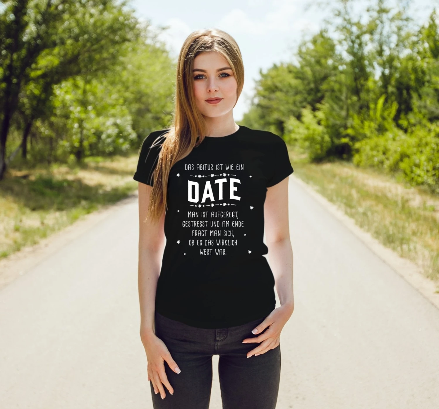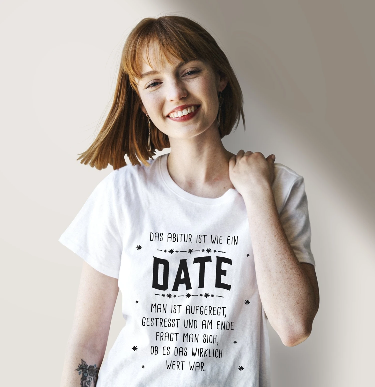 T-Shirt mit Spruch: Das Abitur ist wie ein Date 🌟 Man ist aufgeregt, gestresst und am Ende fragt man sich, ob es das wirklich wert war.