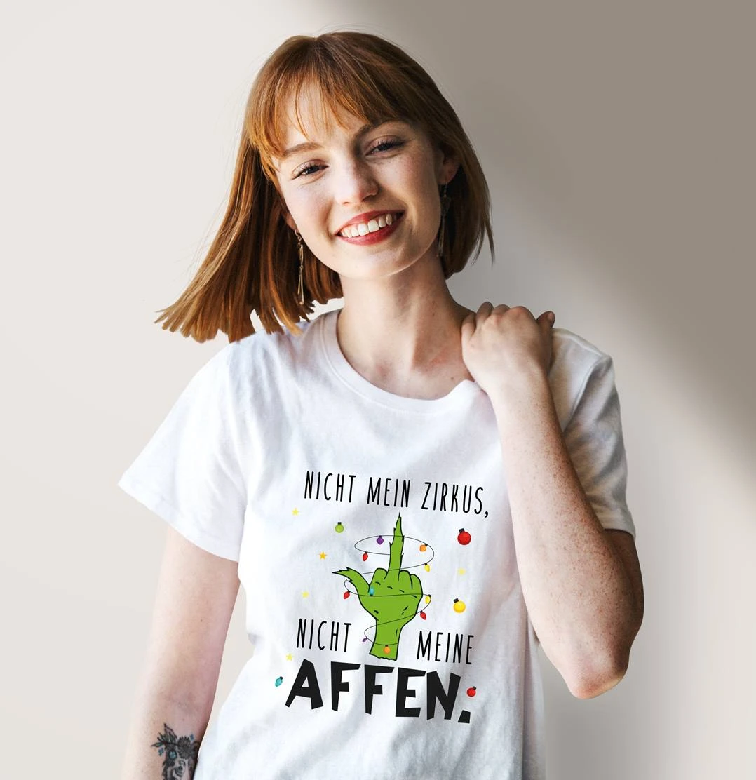 Wenn du ein Geschenk für Damen oder speziell ein Geschenk für Frauen suchst, die Weihnachten mit einem Augenzwinkern sehen und den Grinch Mittelfinger genauso feiern wie du, dann ist dieses Shirt ein absolutes Must-have! Es ist mehr als nur ein T-Shirt, es ist eine Einstellung. So, und jetzt: Lasst den Zirkus beginnen, aber ohne uns – denn es sind ja nicht unsere Affen!