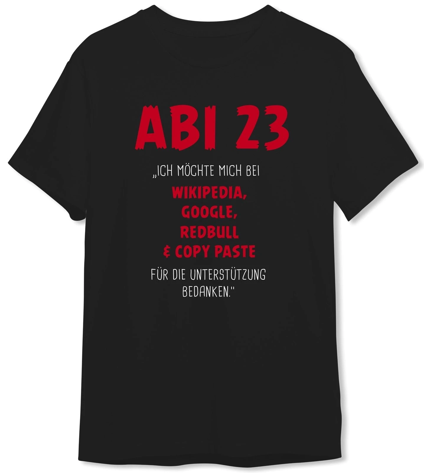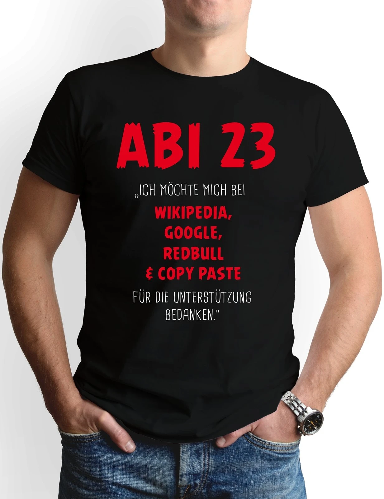 T-Shirt mit Spruch: Abi 23 – „Ich möchte mich bei Wikipedia, Google, Redbull & copy paste für die Unterstützung bedanken.“