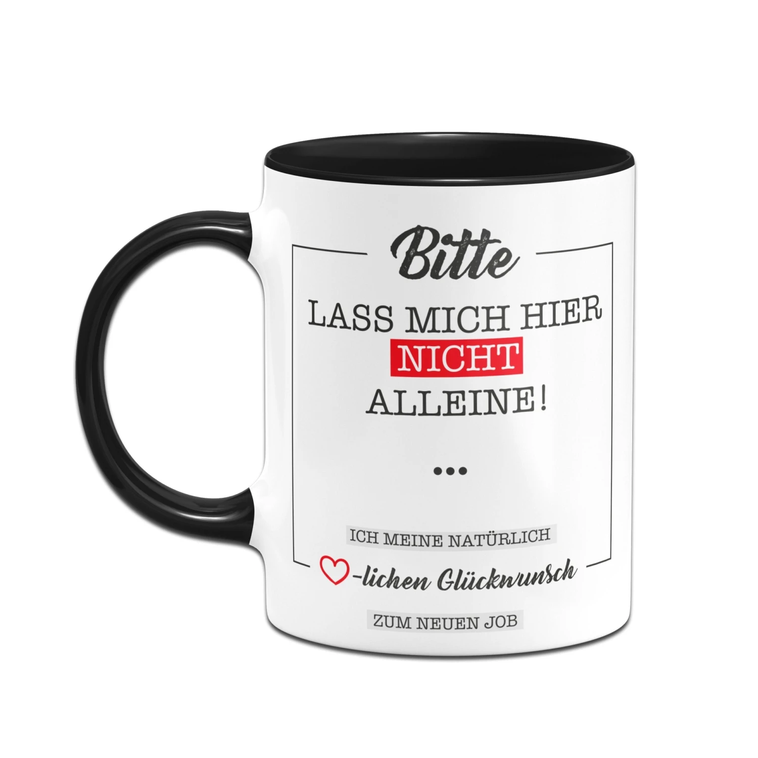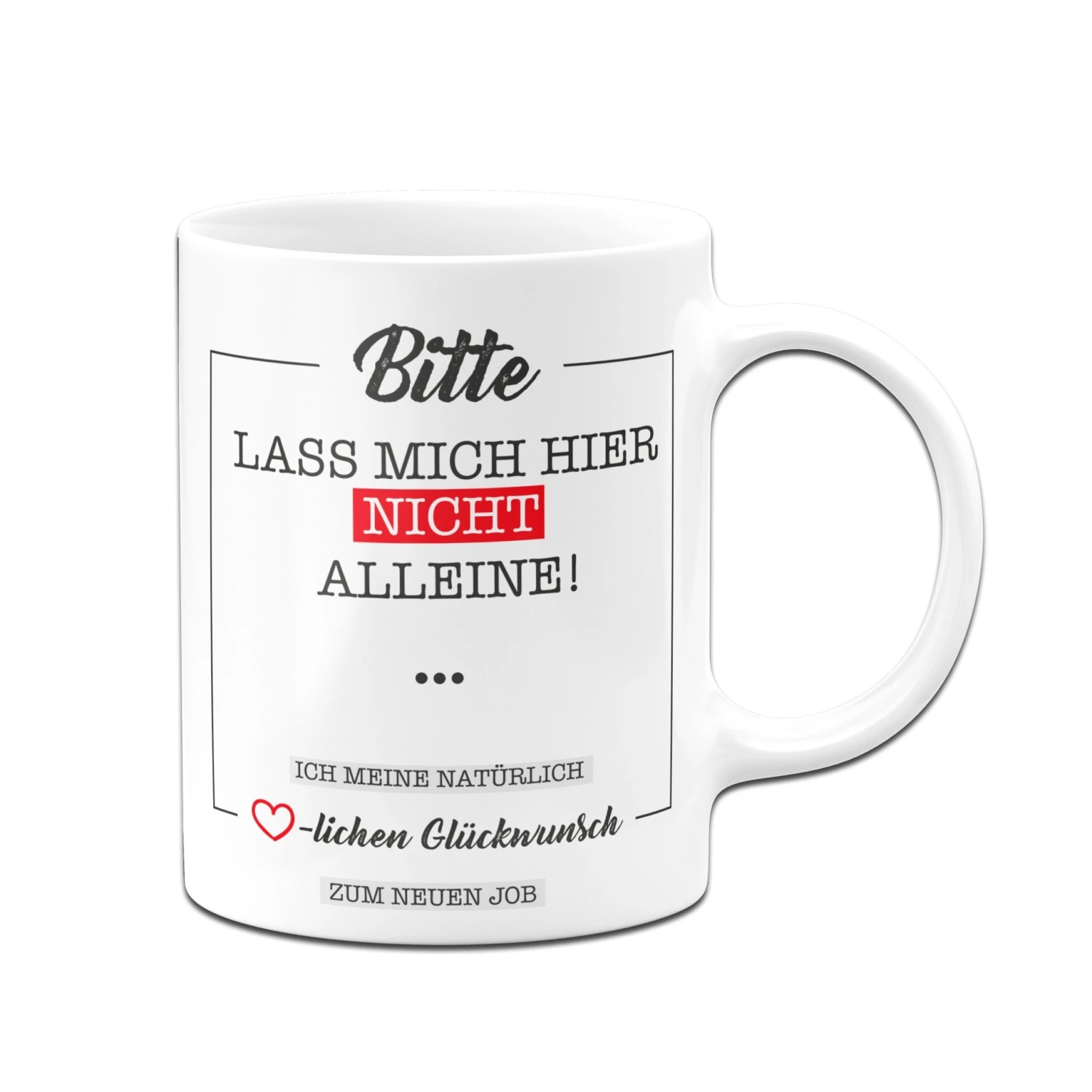 Tasse mit Spruch: Bitte lass mich hier nicht alleine! Ich meine natürlich ❤️-lichen Glückwunsch zum neuen Job.