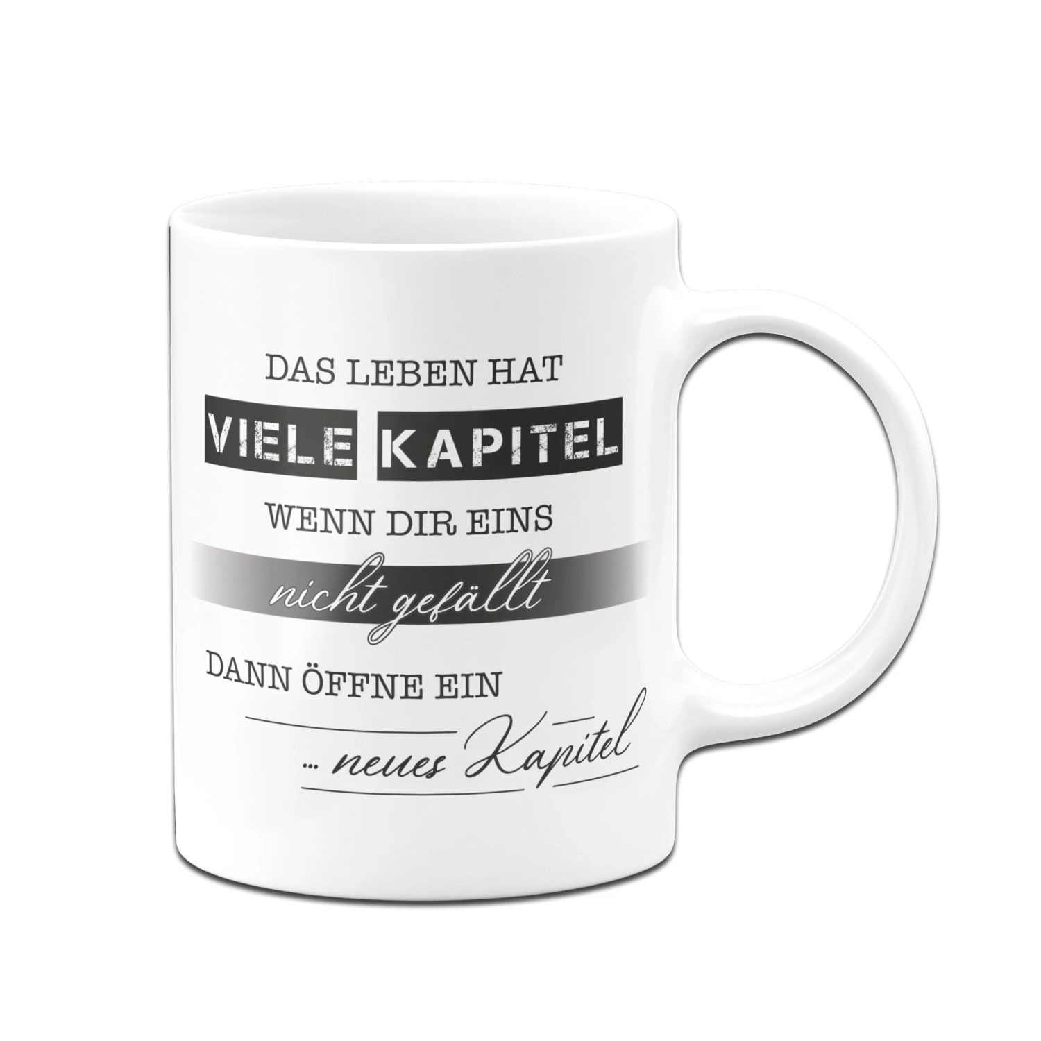 Motivations-Tasse mit Spruch: Das Leben hat viele Kapitel, wenn die eins nicht gefällt, dann öffne ein neues Kapitel.