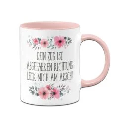 Blümchen-Tasse 🌸 mit Spruch: Dein Zug ist abgefahren Richtung leck mich am Arsch!