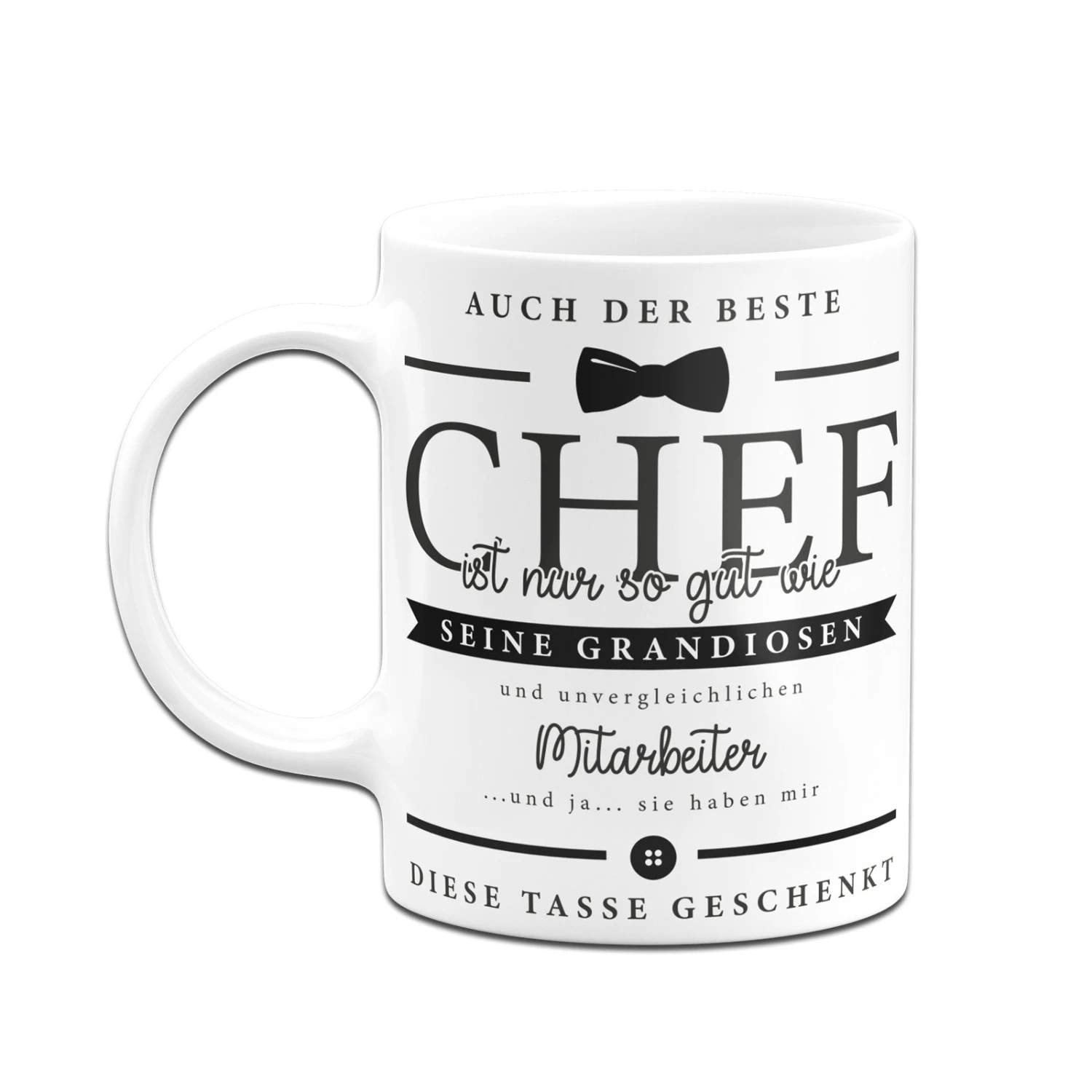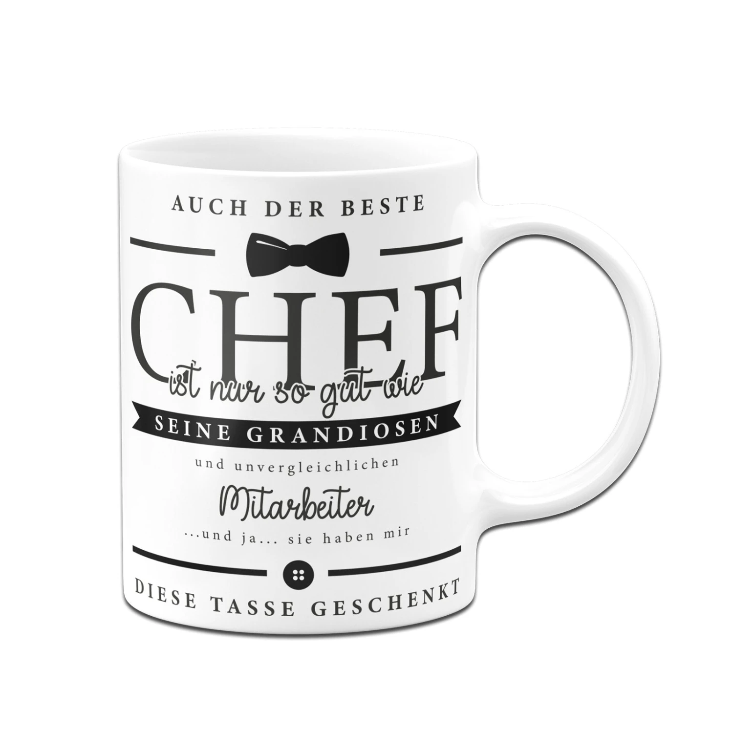 Tasse mit Spruch: Auch der beste Chef ist nur so gut wie seine grandiosen und unvergleichlichen Mitarbeiter …und ja… sie haben mir diese Tasse geschenkt.