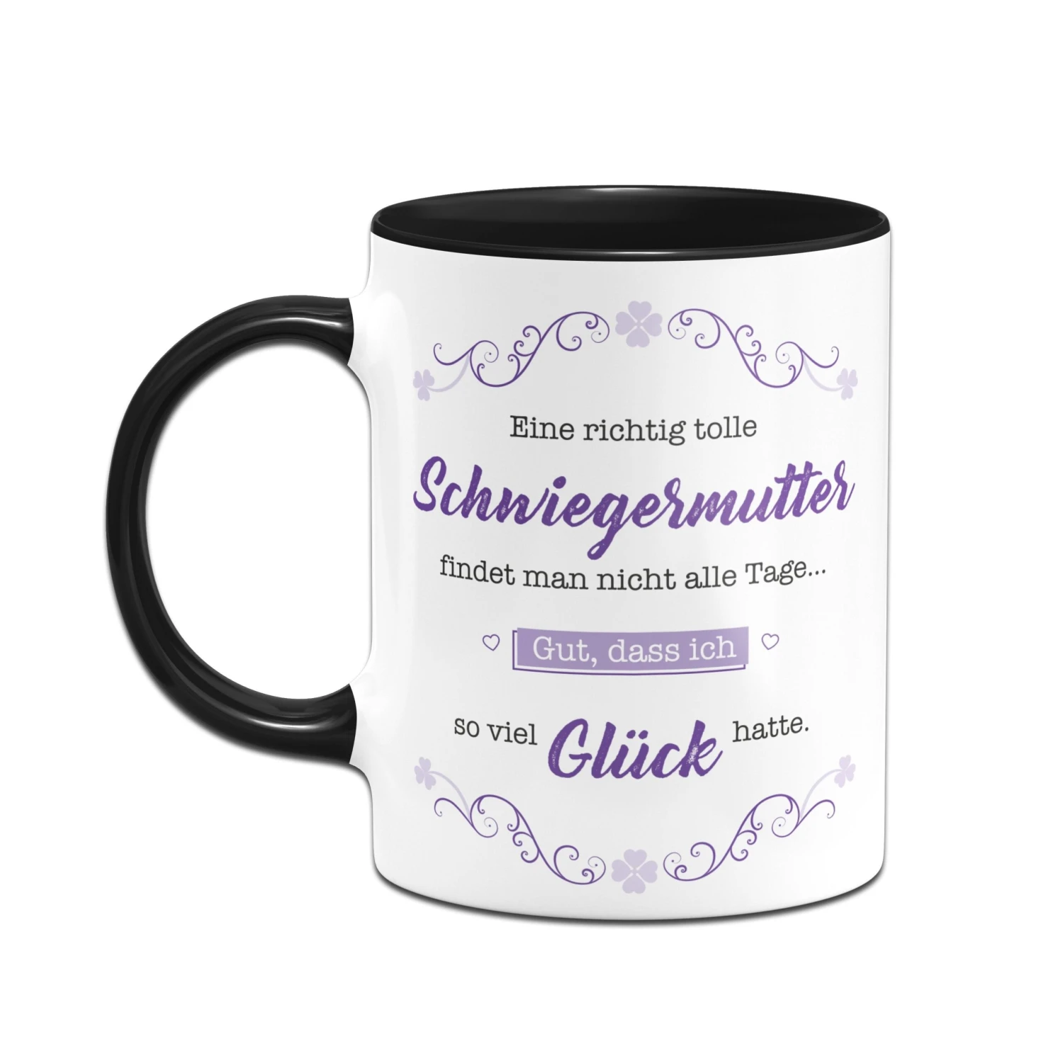 Tasse mit Spruch: Eine richtig tolle Schwiegermutter findet man nicht alle Tage… Gut, dass ich so viel Glück hatte. 🍀