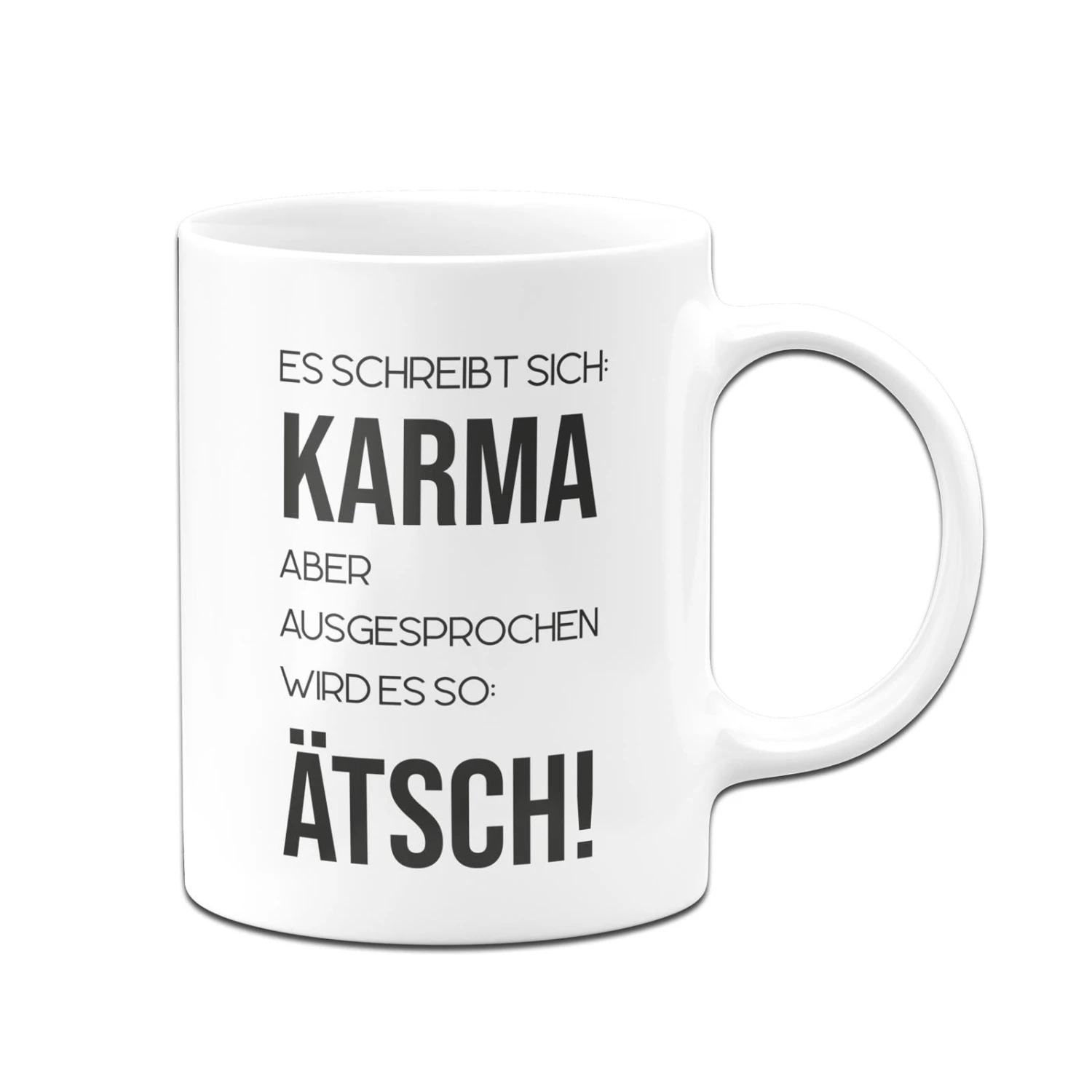 Tasse mit Spruch: Es schreibt sich: KARMA aber ausgesprochen wird es so: ÄTSCH!