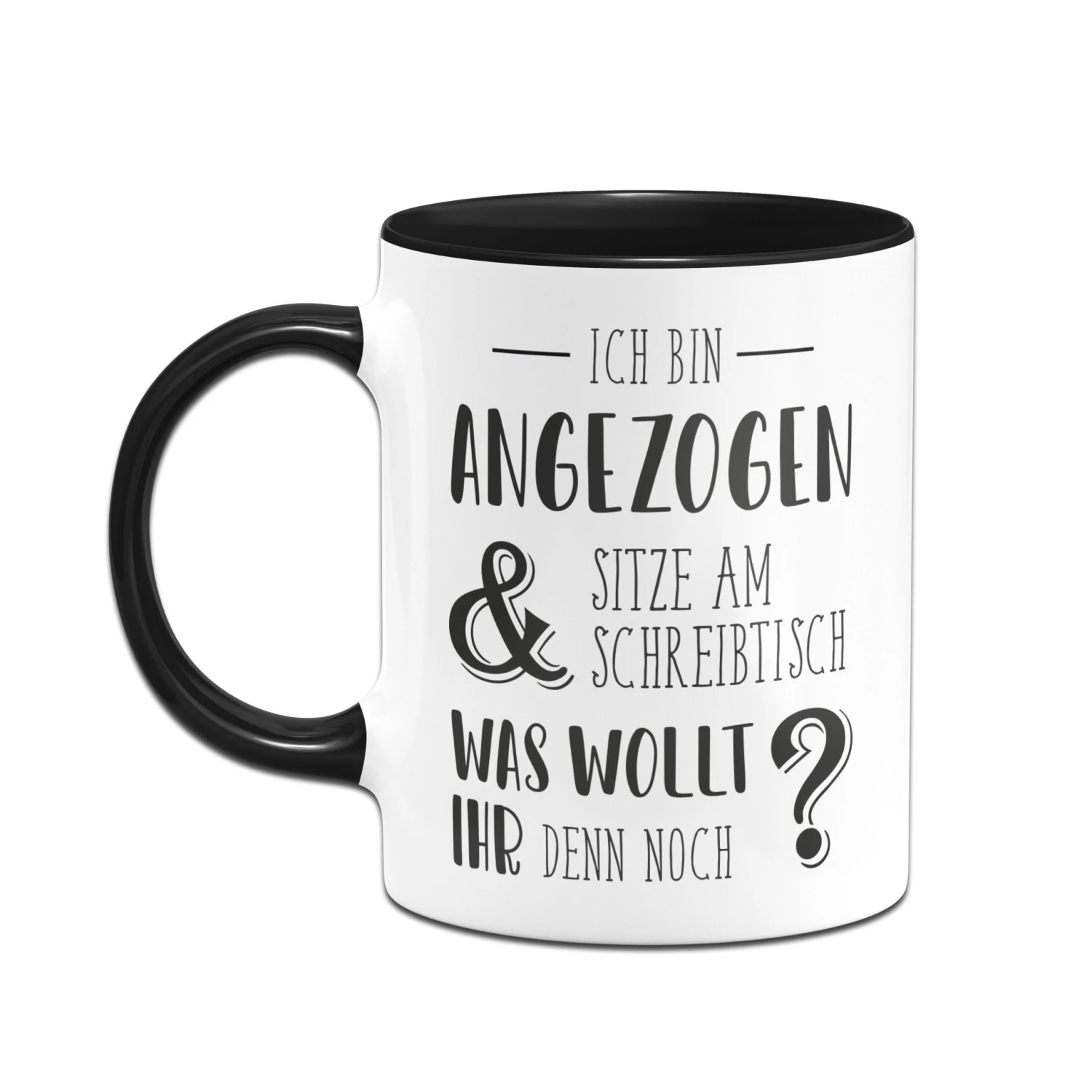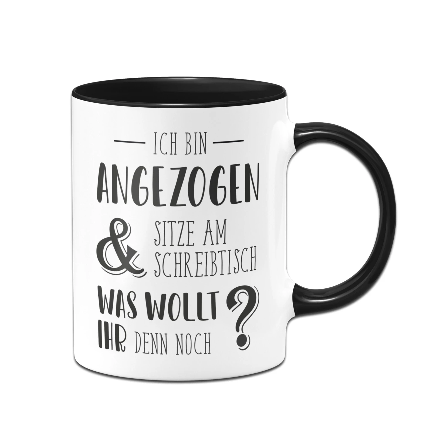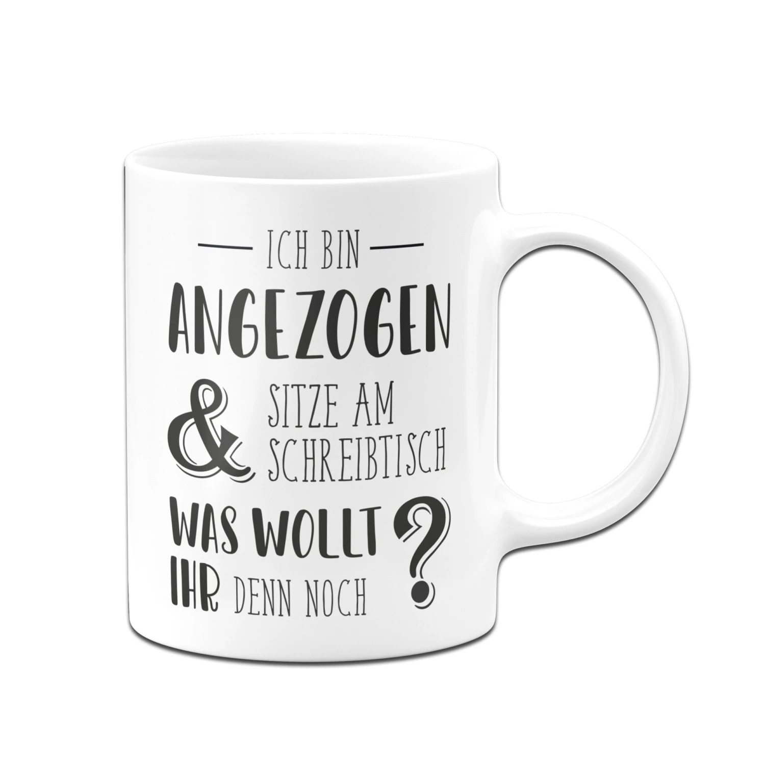 Tasse mit Spruch: Ich bin angezogen und sitze am Schreibtisch. Was wollt ihr denn noch?