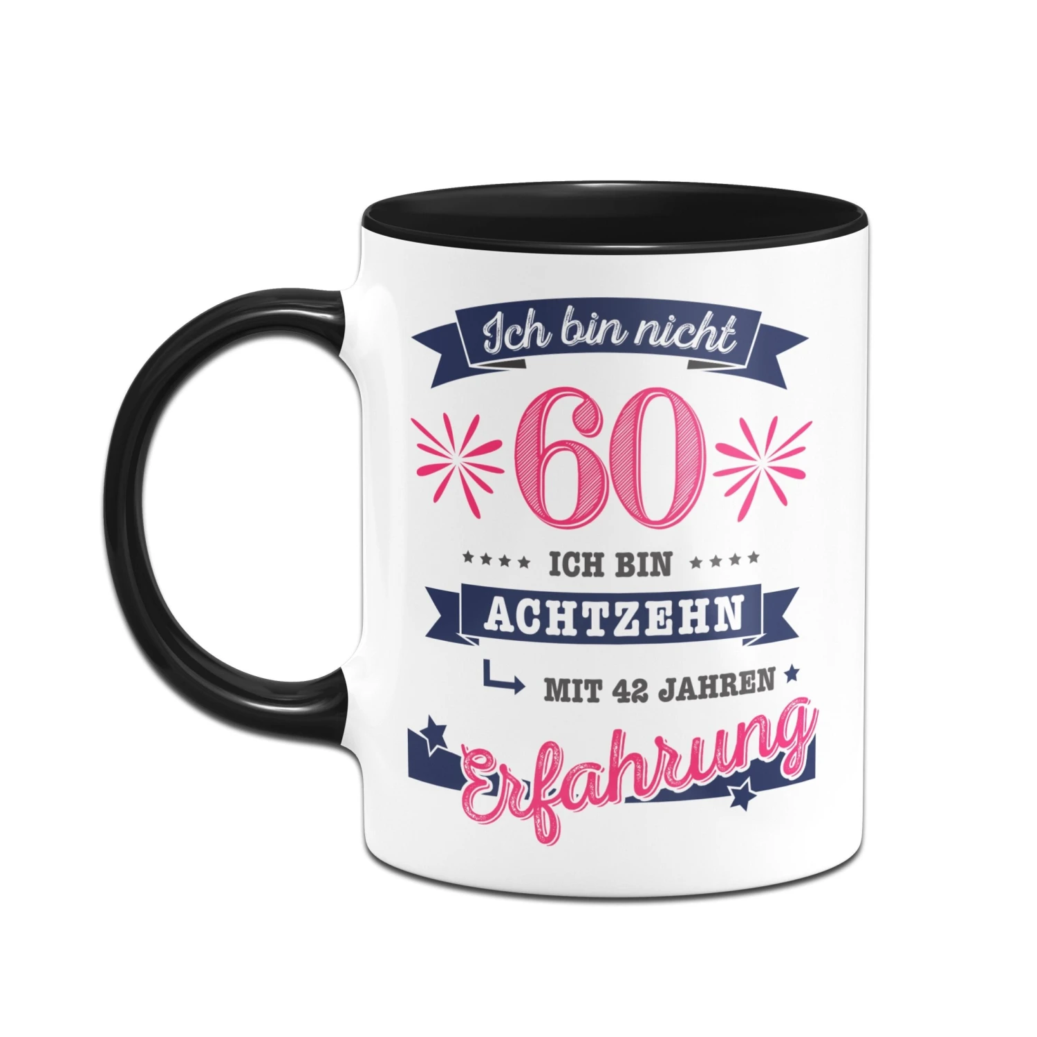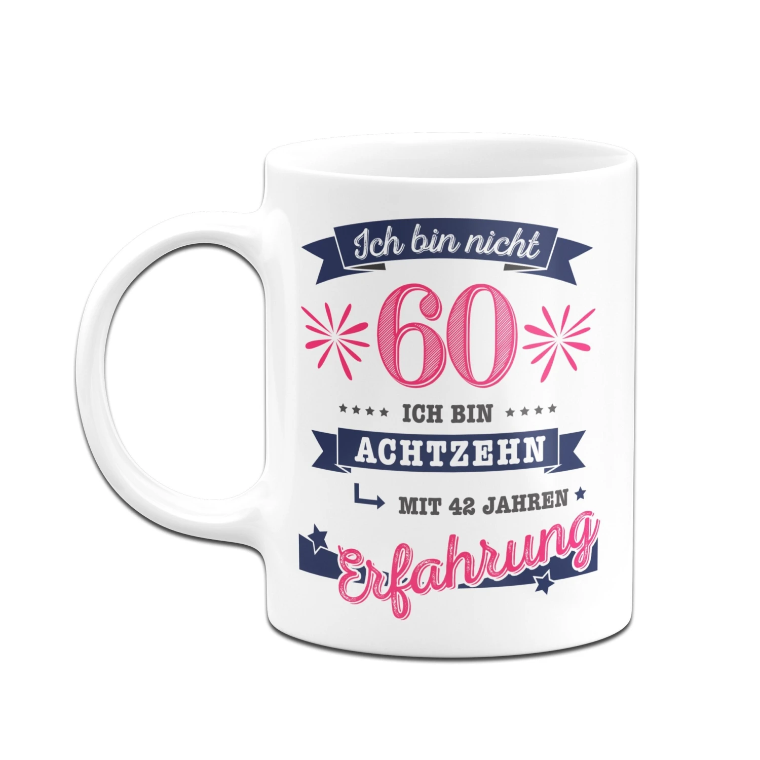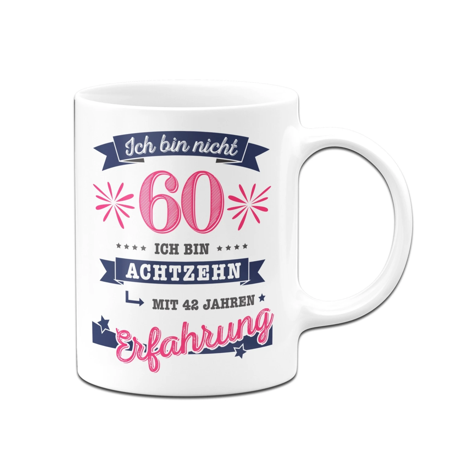 Tasse zum Geburtstag mit Spruch: Ich bin nicht 60. Ich bin achtzehn mit 42 Jahren Erfahrung! 🥳