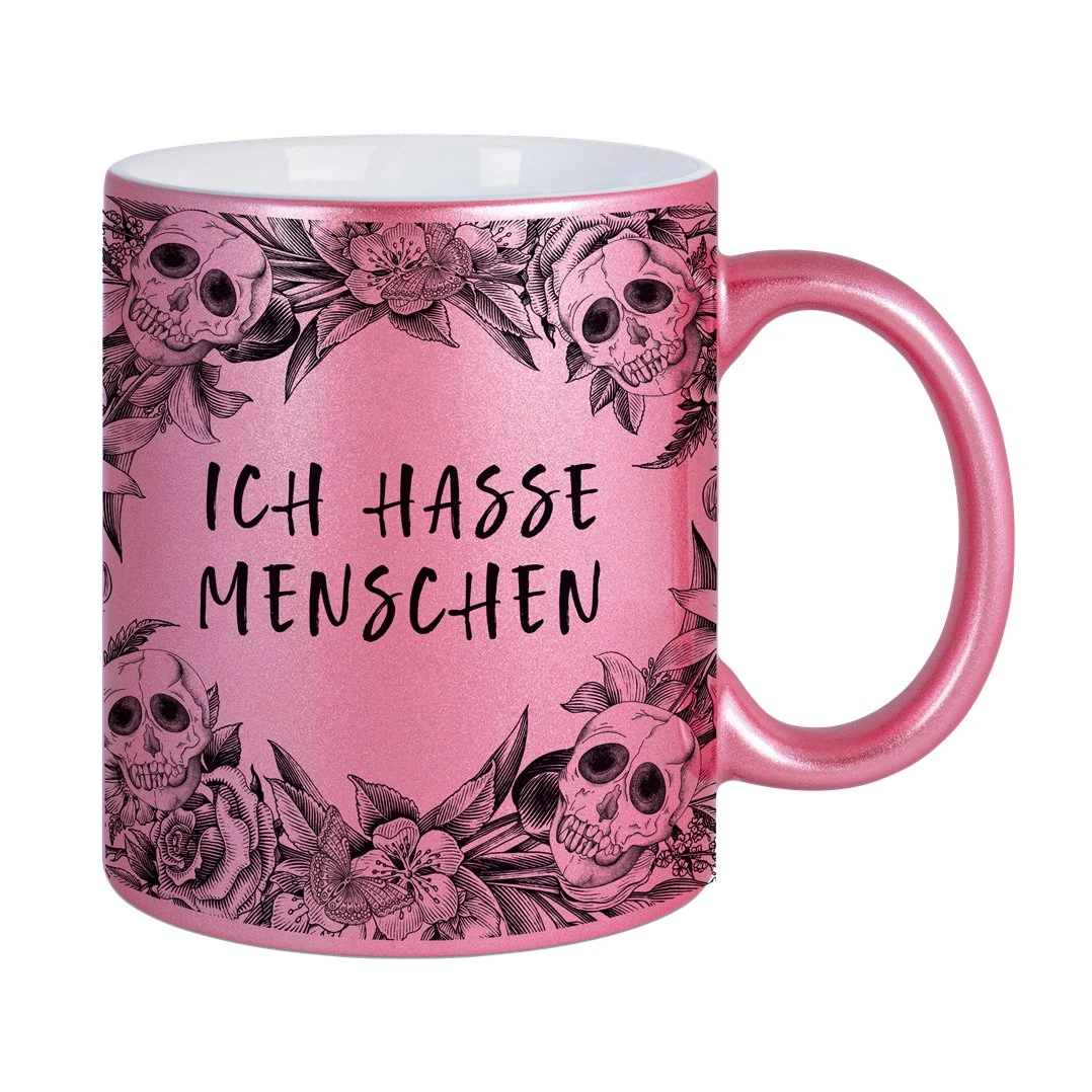 Du bist nicht der typische Morgenmensch und bevorzugst die Stille deines Kaffees über Gespräche? Dann ist unsere besondere Tasse aus Keramik mit dem provokanten Spruch „Ich hasse Menschen“ in der Skull Statement Metallic-Edition genau das Richtige für dich. Mit ihrem coolen Totenkopf-Design ist sie das ideale Geschenk für Kollegen oder Freunde, die ihre Ruhe schätzen und eine klare Botschaft senden wollen. In einem ansprechenden Rosa-Metallic gehalten, wird sie zum absoluten Hingucker auf deinem Schreibtisch.