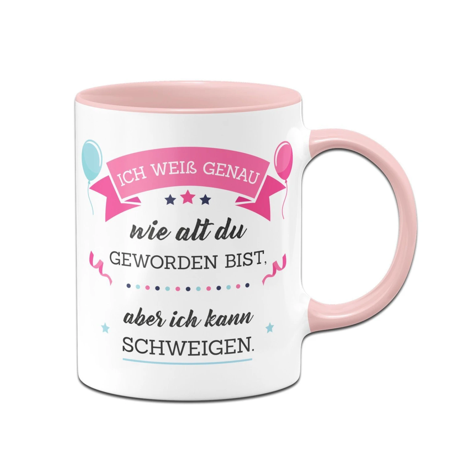 Tasse zum Geburtstag mit Spruch: Ich weiß genau wie alt du geworden bist, aber ich kann schweigen. 🎈