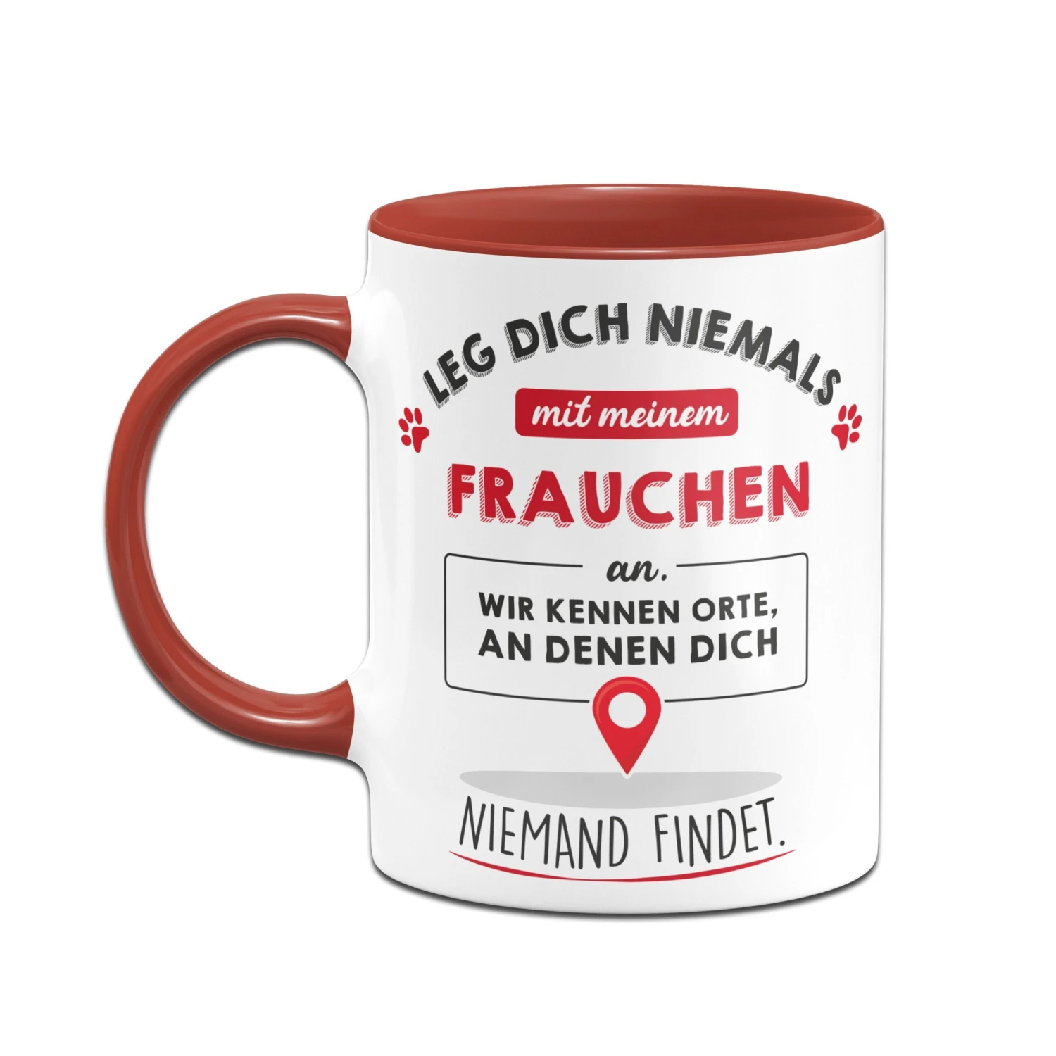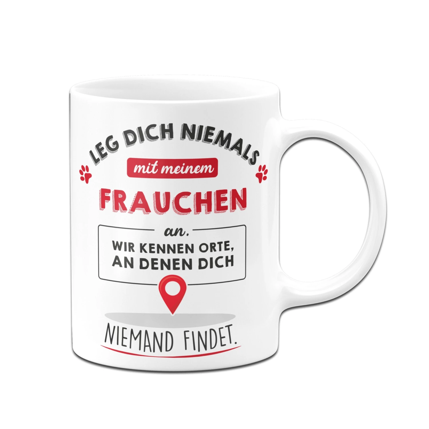 Hundetasse mit Spruch: Leg dich niemals mit meinem Frauchen an, wir kennen Orte, an denen dich niemand findet. 🐾
