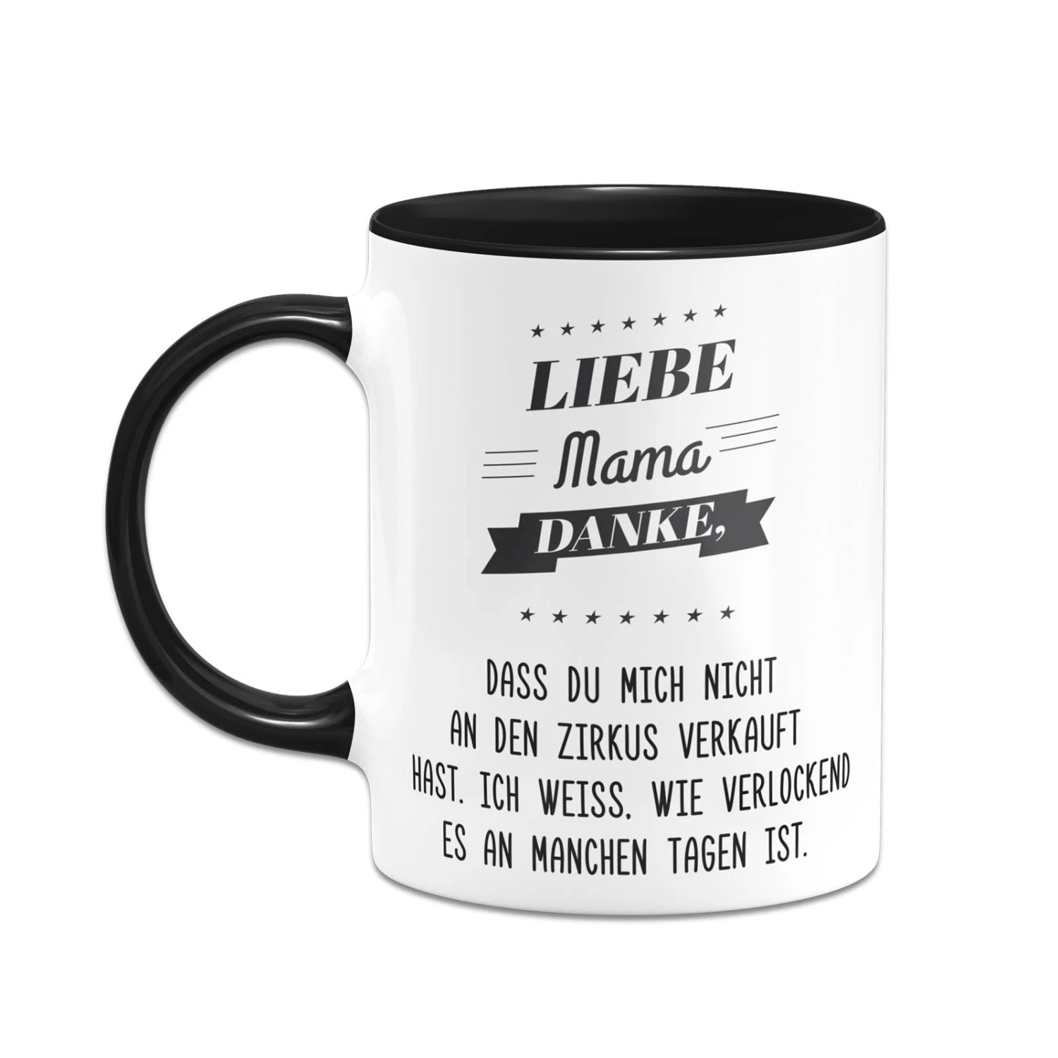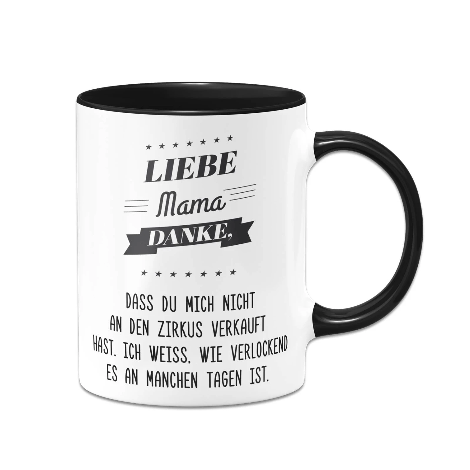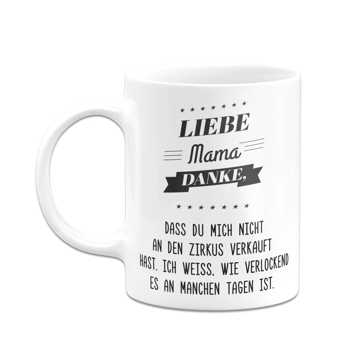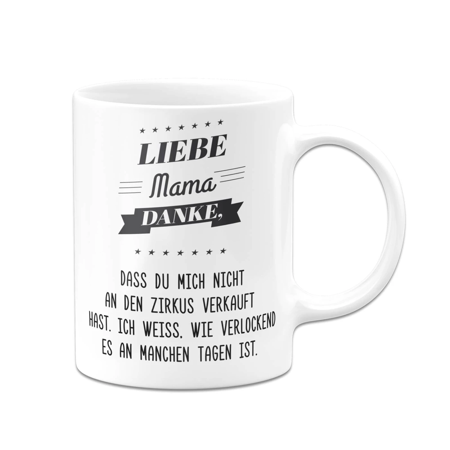 Tasse mit Spruch: Liebe Mama danke, dass Du mich nicht an den Zirkus verkauft hast. Ich weiss, wie verlockend es an manchen Tagen ist. ⭐