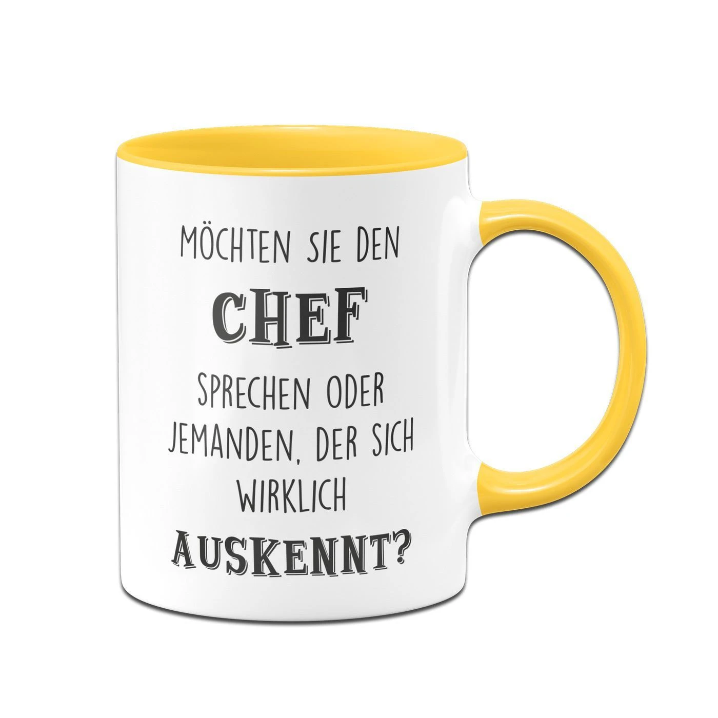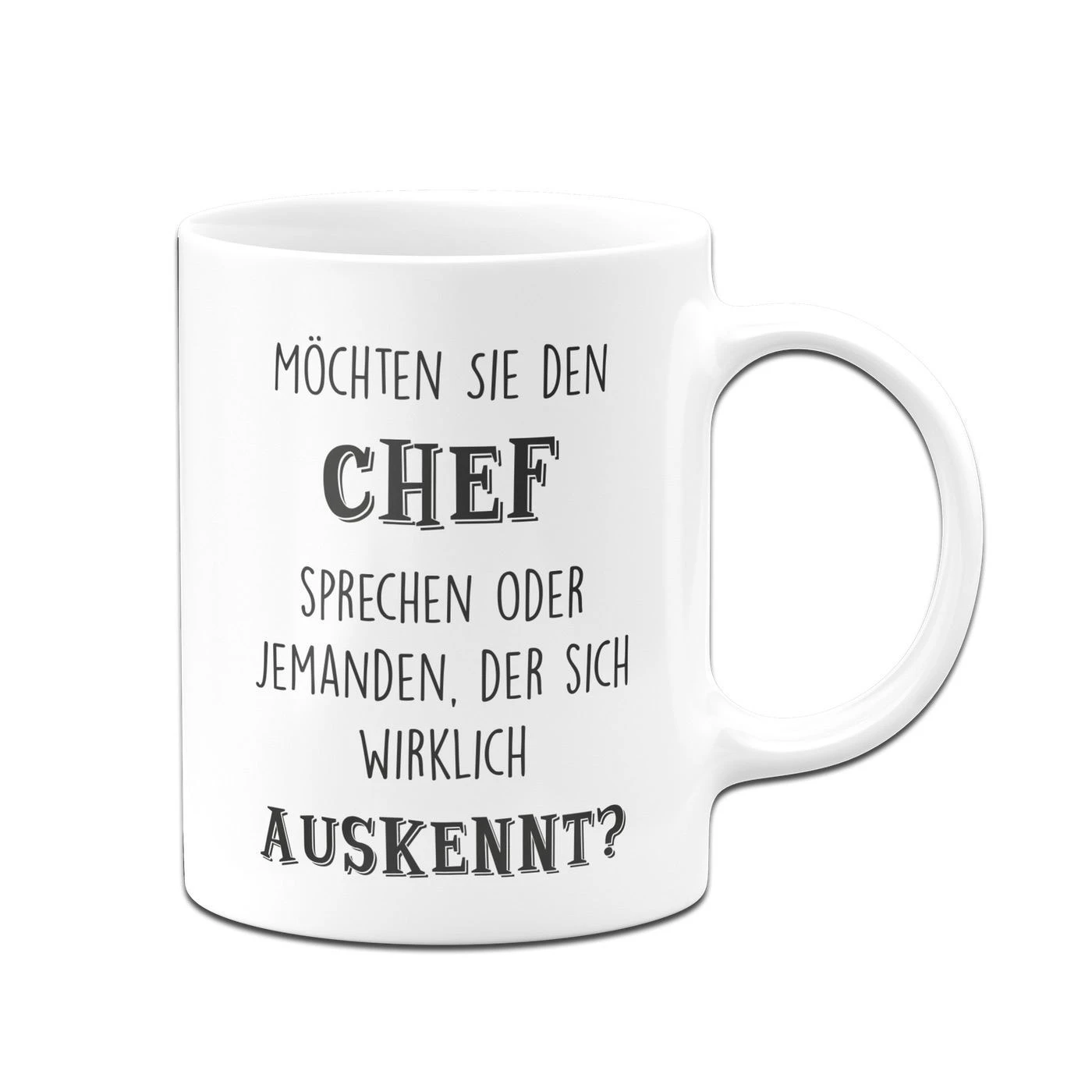 Lustige Tasse mit Spruch: Möchten Sie den Chef sprechen oder jemanden, der sich wirklich auskennt?